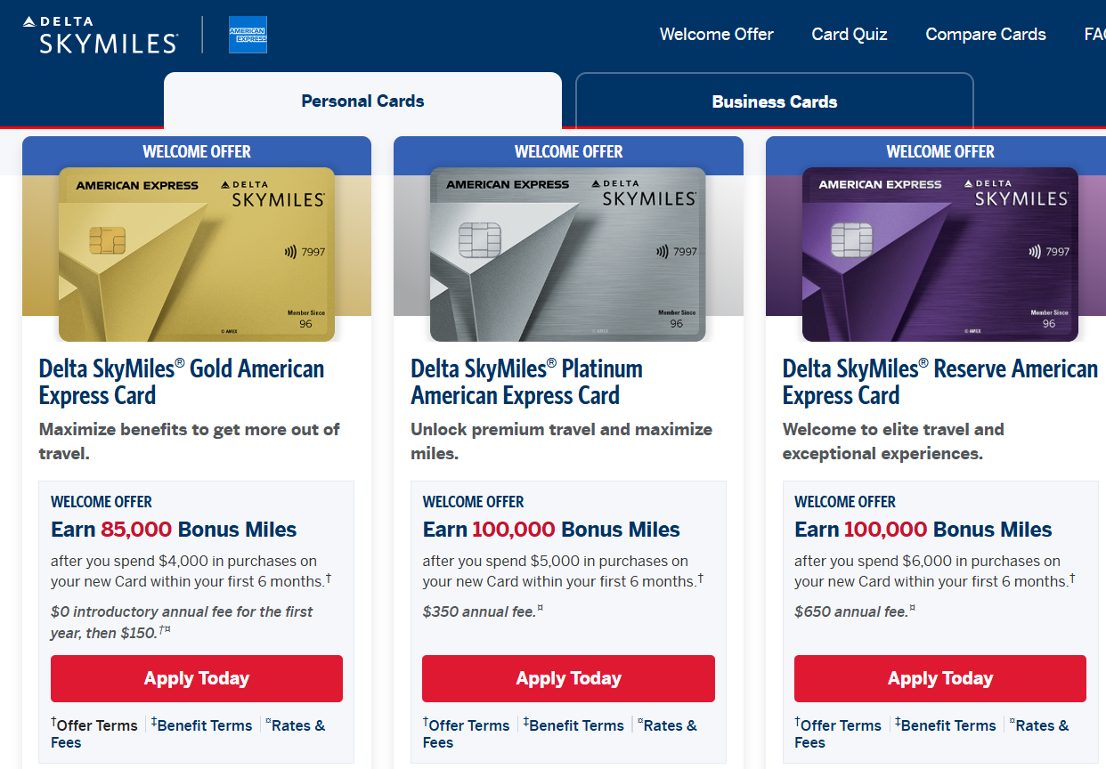 대표적인 델타항공의 세가지 비지니스 카드들이 각각의 독특한 오퍼를 보여줍니다.